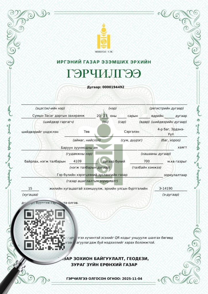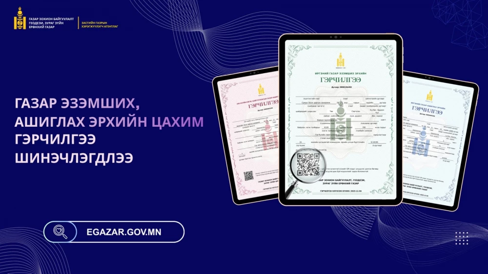 Газар зохион байгуулалт, геодези, зураг зүйн ерөнхий газрын даргын 2025 оны А/185 дугаар “Загвар, маягт батлах тухай” тушаал батлагдсан. Уг тушаалын дагуу иргэн хуулийн этгээдийн газар эзэмших, ашиглах эрхийн цахим гэрчилгээний загварыг шинэчлэн, улсын хэмжээнд үйлчилгээнд нэвтрүүлж эхэллээ. Шинэчилсэн цахим гэрчилгээ нь дараах давуу байдлыг бүрдүүлсэн болно. Үүнд: